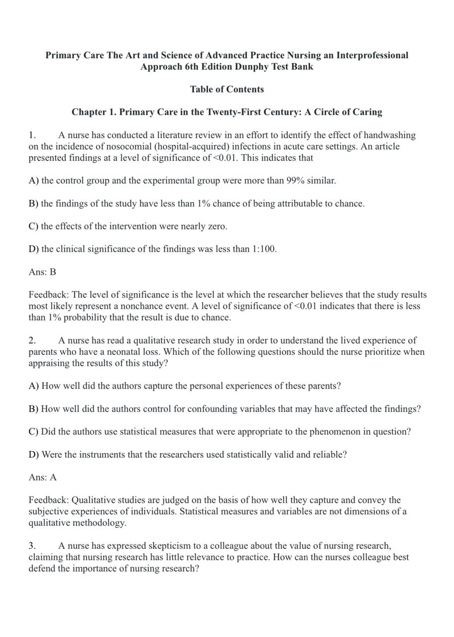 This Test Bank for Primary Care: The Art and Science of Advanced Practice Nursing, an Interprofessional Approach (6th Edition, Dunphy) is an essential resource for advanced practice nursing students and educators aiming to master primary care concepts and interprofessional collaboration. Aligned with the 6th Edition textbook, it offers a comprehensive collection of exam-style questions, critical thinking scenarios, and clinical application exercises to enhance understanding and prepare for assessments.
