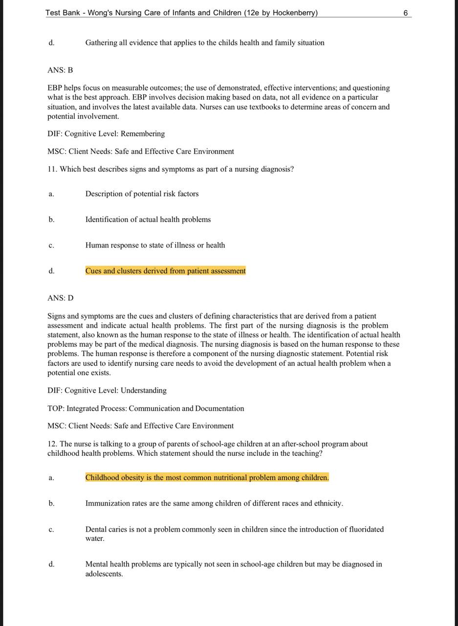 This Test Bank for Wong’s Nursing Care of Infants and Children (12th Edition, Hockenberry) is an essential resource for nursing students and educators aiming to master pediatric nursing concepts. Aligned with the 12th Edition textbook, it offers a comprehensive collection of exam-style questions, critical thinking scenarios, and clinical application exercises to enhance understanding and prepare for assessments.